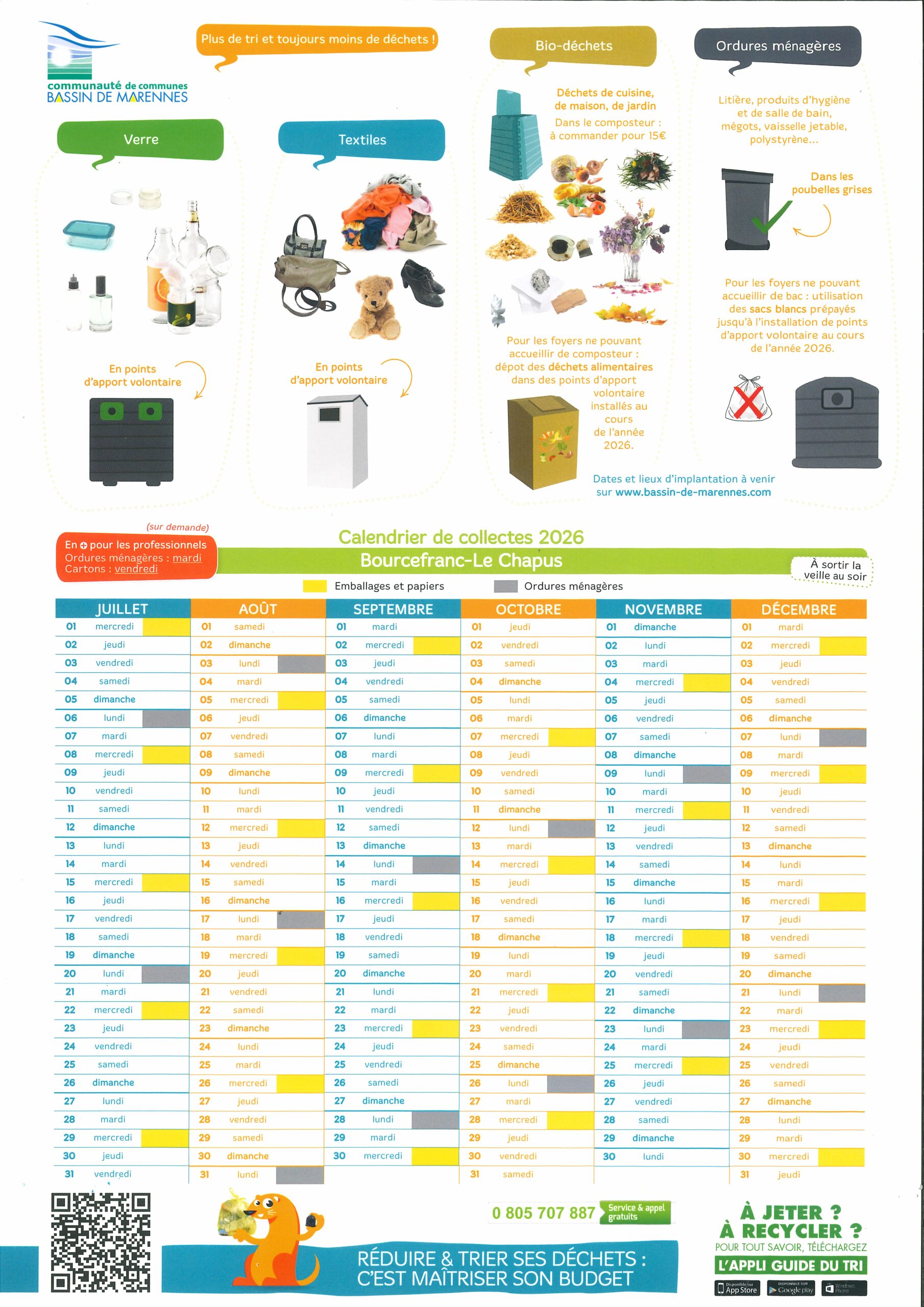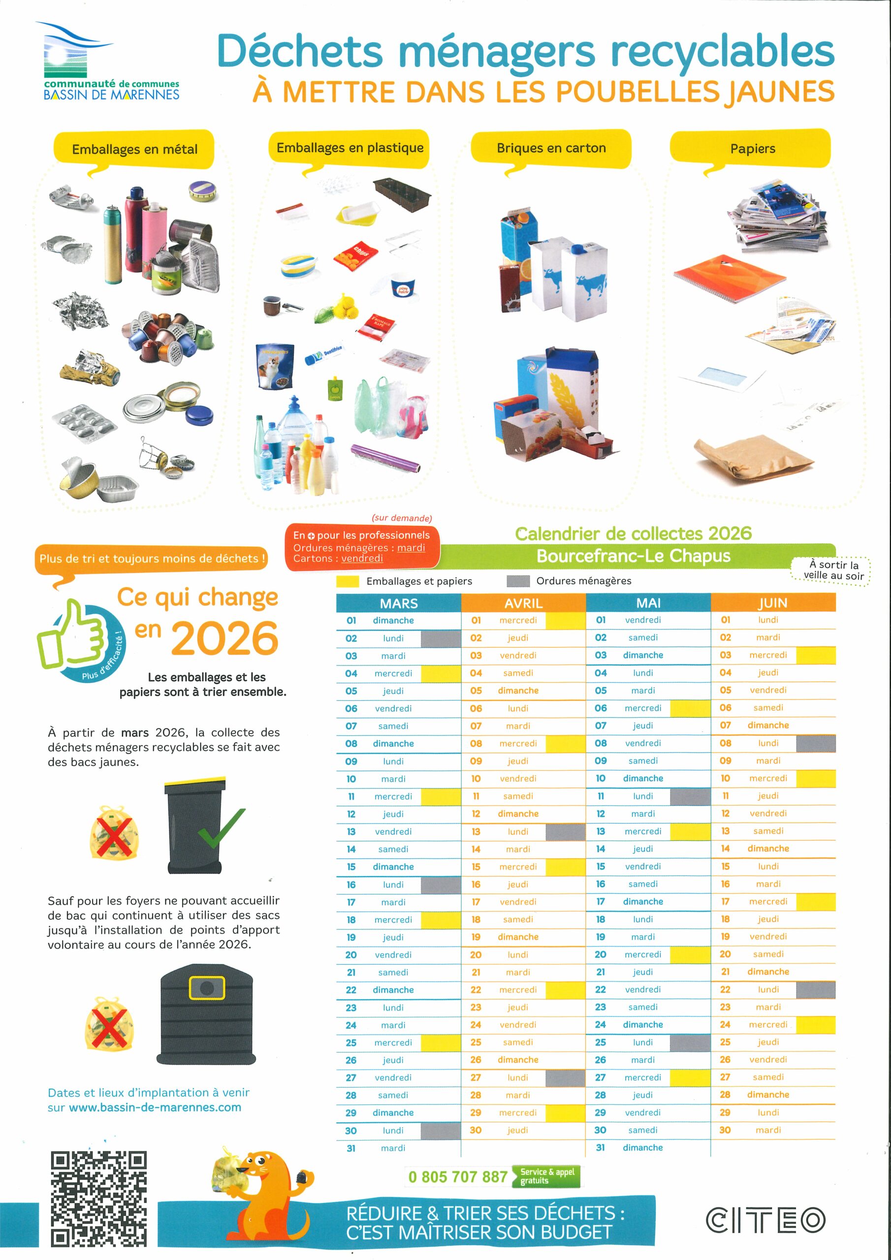 Calendrier de collecte des déchets en vigueur à compter du 1er mars 2026